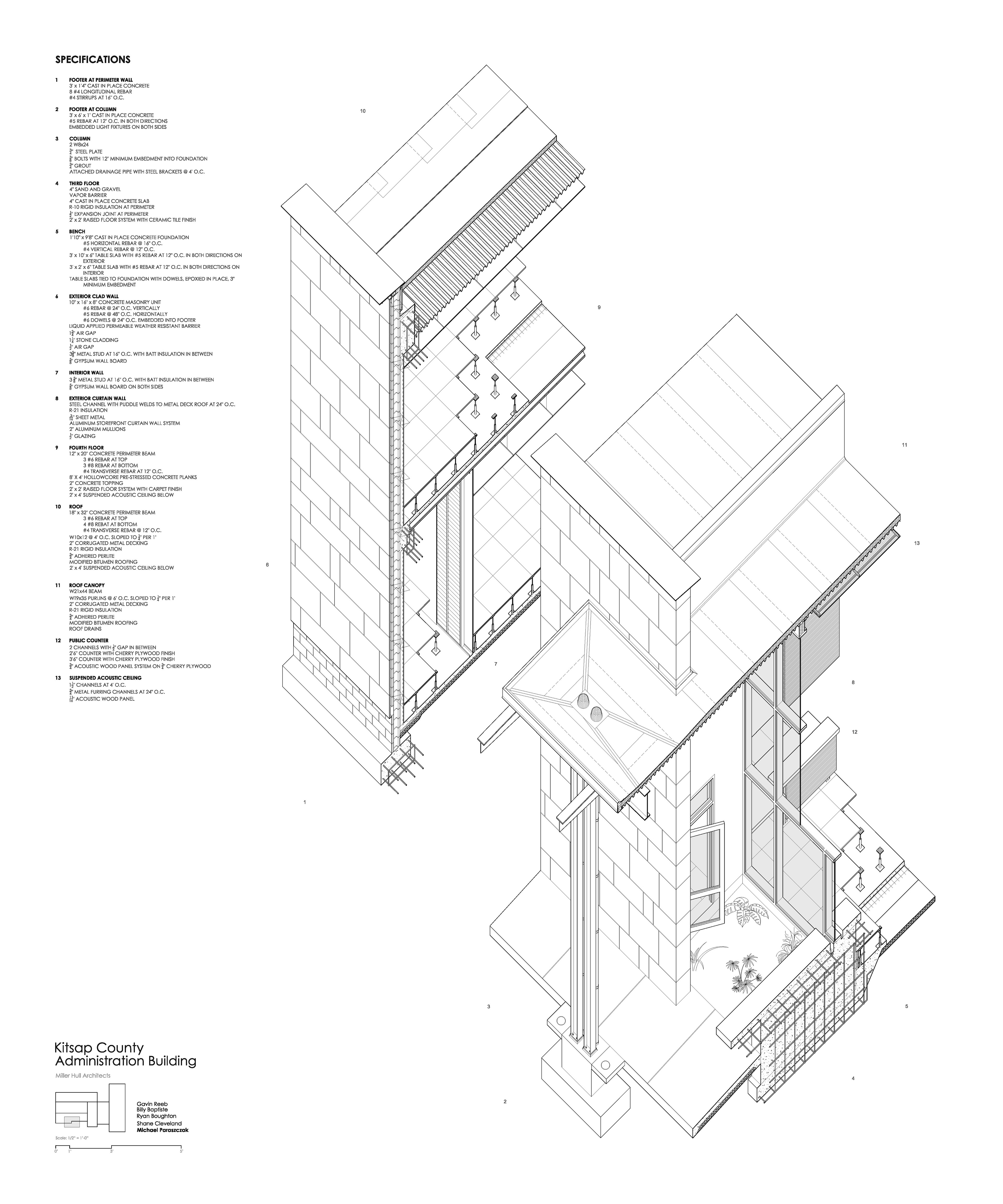 In this class, I learned about the physical implementation and graphic representation of different construction methods and materials. Along with a lecture, the class comprised of a drawing studio. In this studio, I researched and examined the construction documents of two projects by two different architects using two different construction methods. Using these documents, I generated sectional axonometric construction drawings of portions of each project.