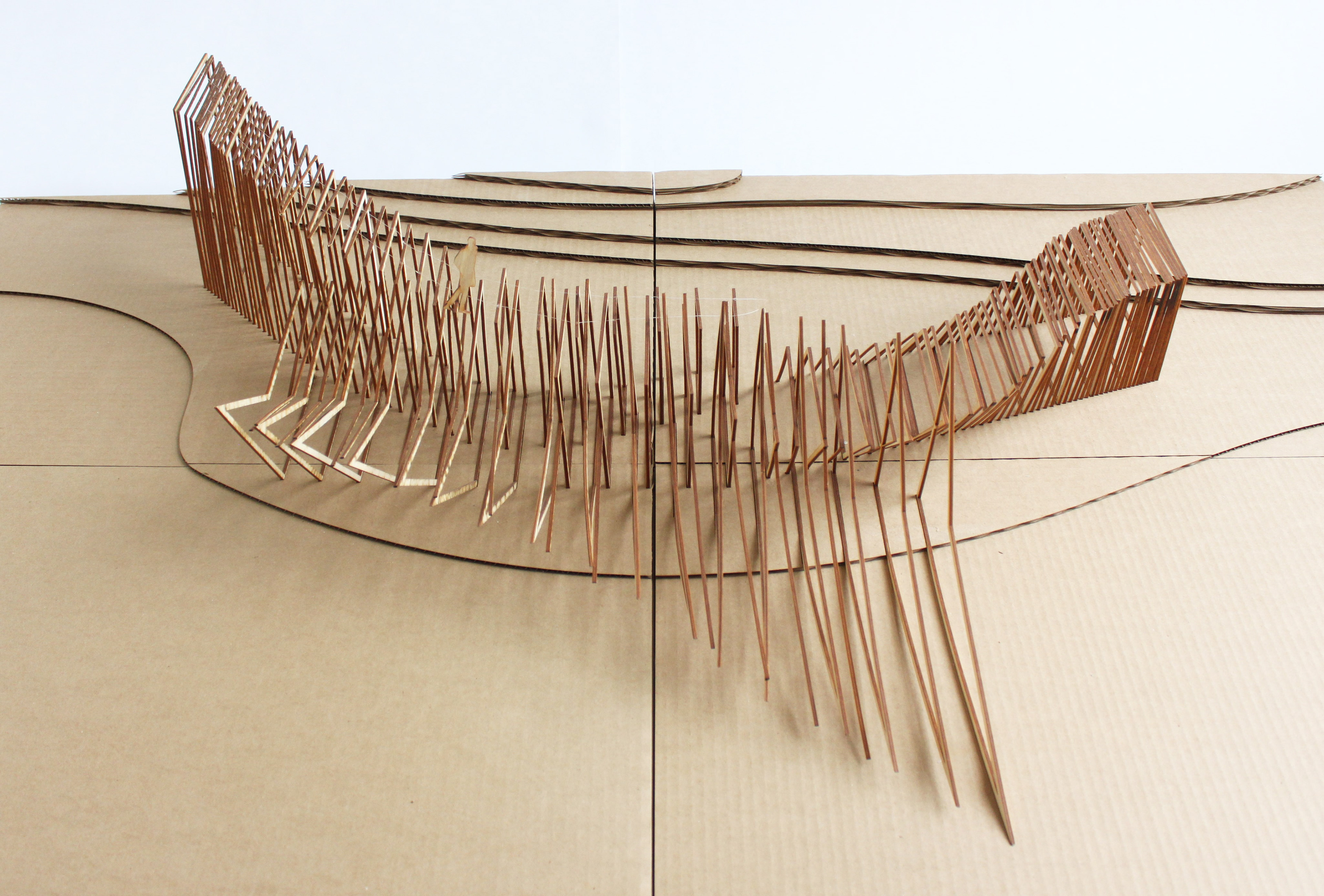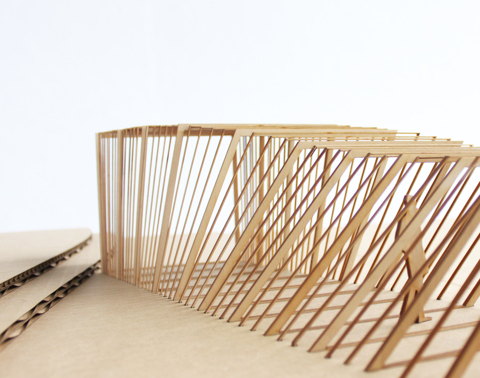 This pavilion takes the movement of natural elements and converts it into a spatial experience. Wooden frames mimic the movements of trees, grass, and ice as a person walks through the three different forms, much like how a series of pictures forms a moving video when experienced in motion. These three separate forms then converge all at once, allowing the inhabitant walking through them to interchange between the different forms and experience their movements’ simultaneously. There are no places to sit or rest in this pavilion: the only way it can be properly experienced is through an inhabitant’s constant movement through it.